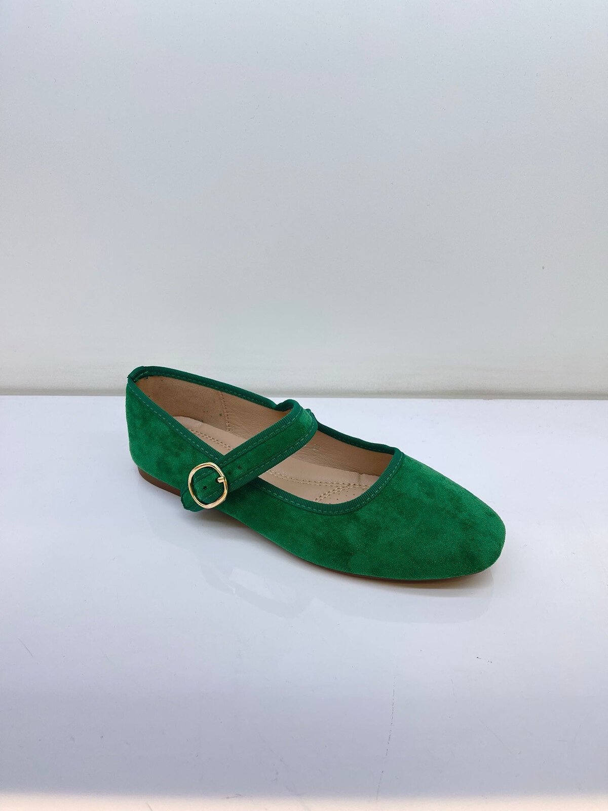 Diese eleganten Ballerinas in leuchtendem Smaragdgrün sind ein echter Hingucker! Der weiche Velours-Look verleiht ihnen eine luxuriöse Ausstrahlung, während das schmale Riemchen mit goldener Schnalle für einen femininen Touch sorgt. Die flache Sohle bietet höchsten Komfort und macht sie zum perfekten Begleiter für stilvolle Alltagslooks oder besondere Anlässe.