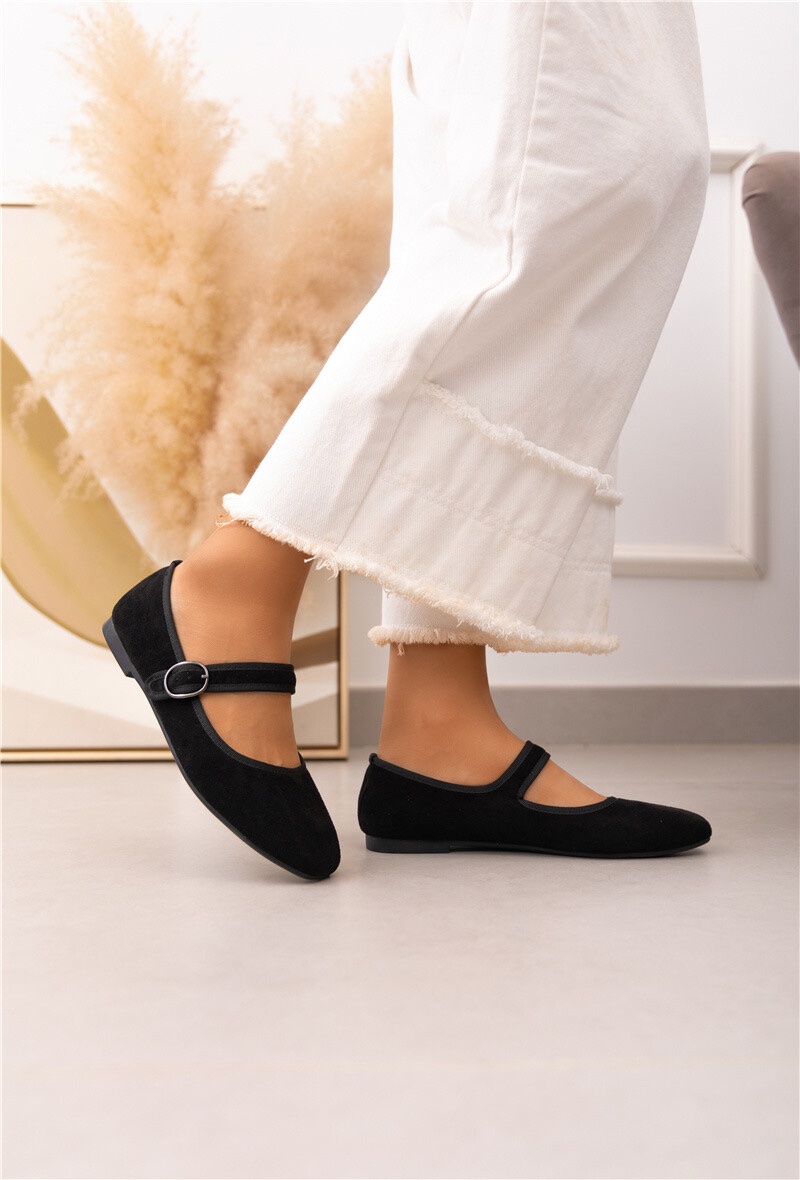 Diese klassischen schwarzen Ballerinas sind die perfekte Mischung aus Eleganz und Komfort. Der weiche Velours-Look verleiht ihnen eine edle Note, während das dezente Riemchen mit silberner Schnalle für einen femininen und stilvollen Touch sorgt. Die flache Sohle macht sie besonders bequem – ideal für den Alltag oder besondere Anlässe.