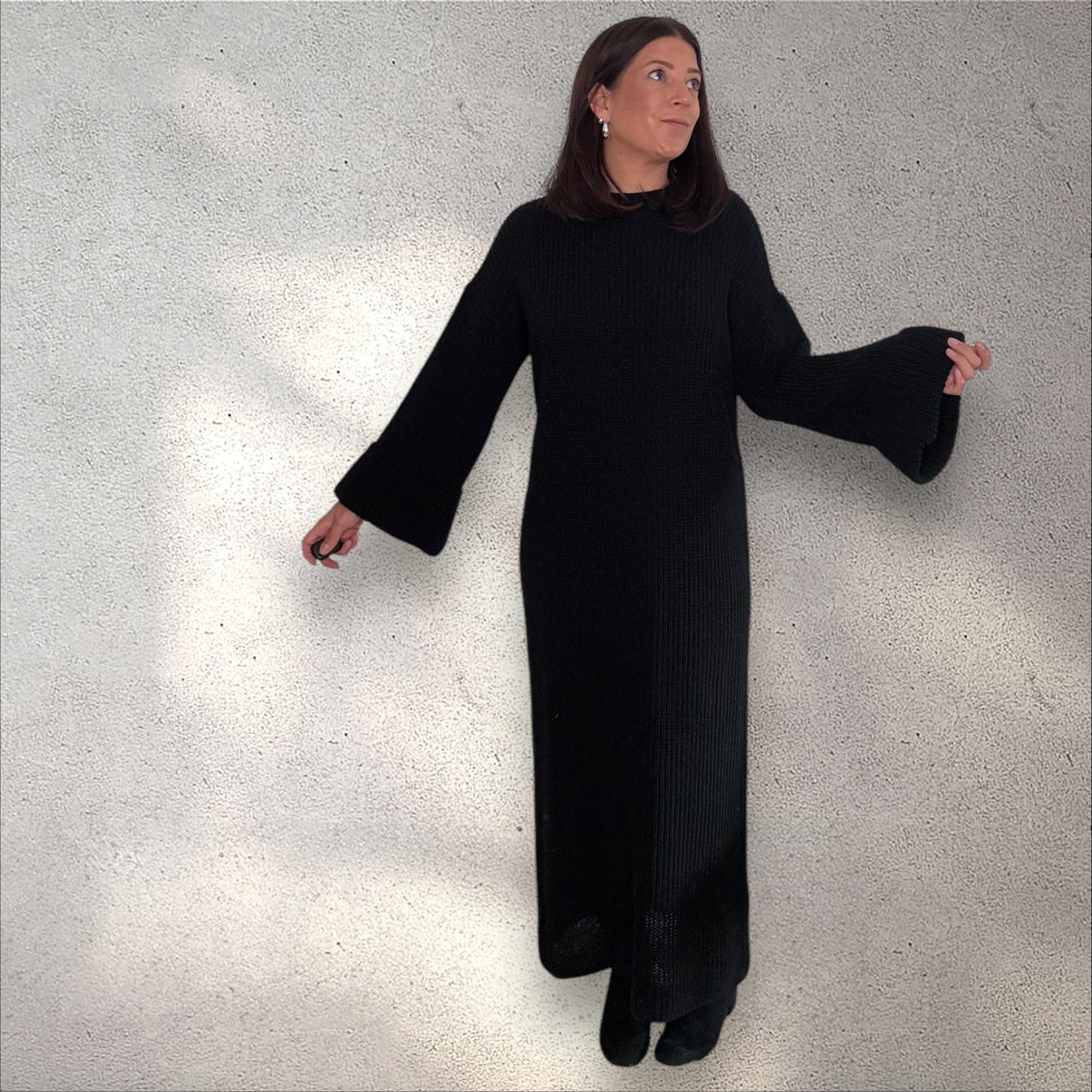 Dieses wunderschöne Maxi-Strickkleid kombiniert höchsten Tragekomfort mit modernem Design. Der lockere Schnitt umspielt die Figur, während die leicht ausgestellten Ärmel und die feine Strickstruktur dem Kleid eine elegante und zugleich lässige Note verleihen. Das edle schwarz macht es zu einem vielseitigen Begleiter für jede Gelegenheit.
