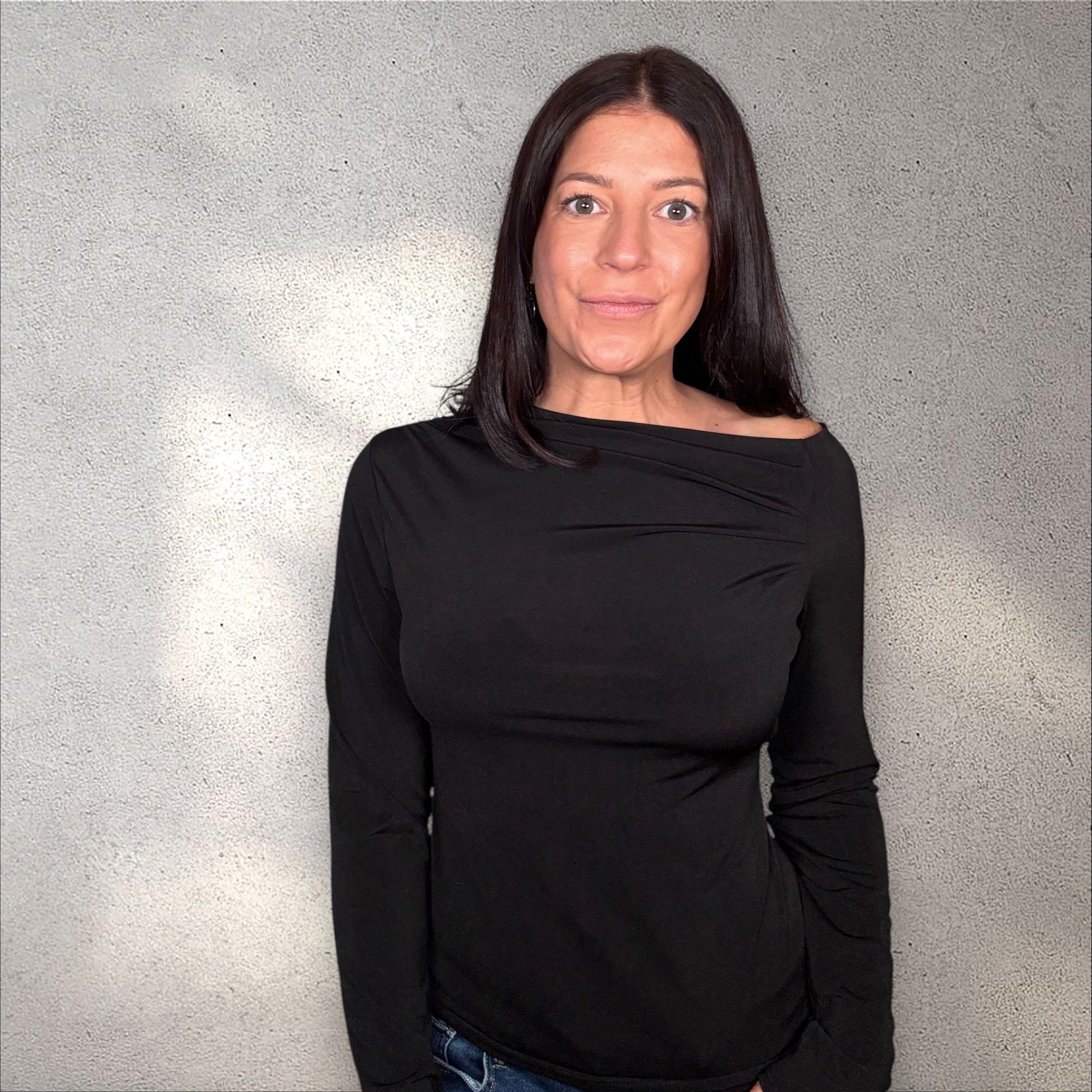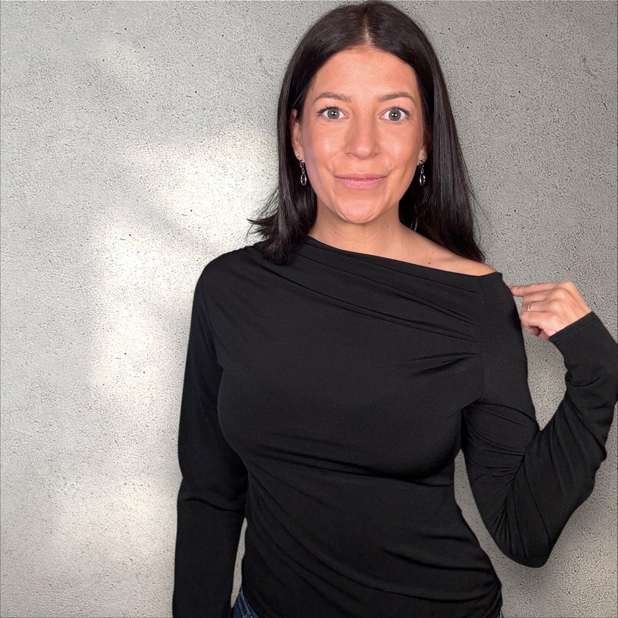 Dieses elegante schwarze Oberteil vereint Schlichtheit und Raffinesse. Der leicht asymmetrische Ausschnitt mit zarten Falten verleiht dem klassischen Design einen modernen Touch, während die figurbetonte Passform eine feminine Silhouette unterstreicht.
