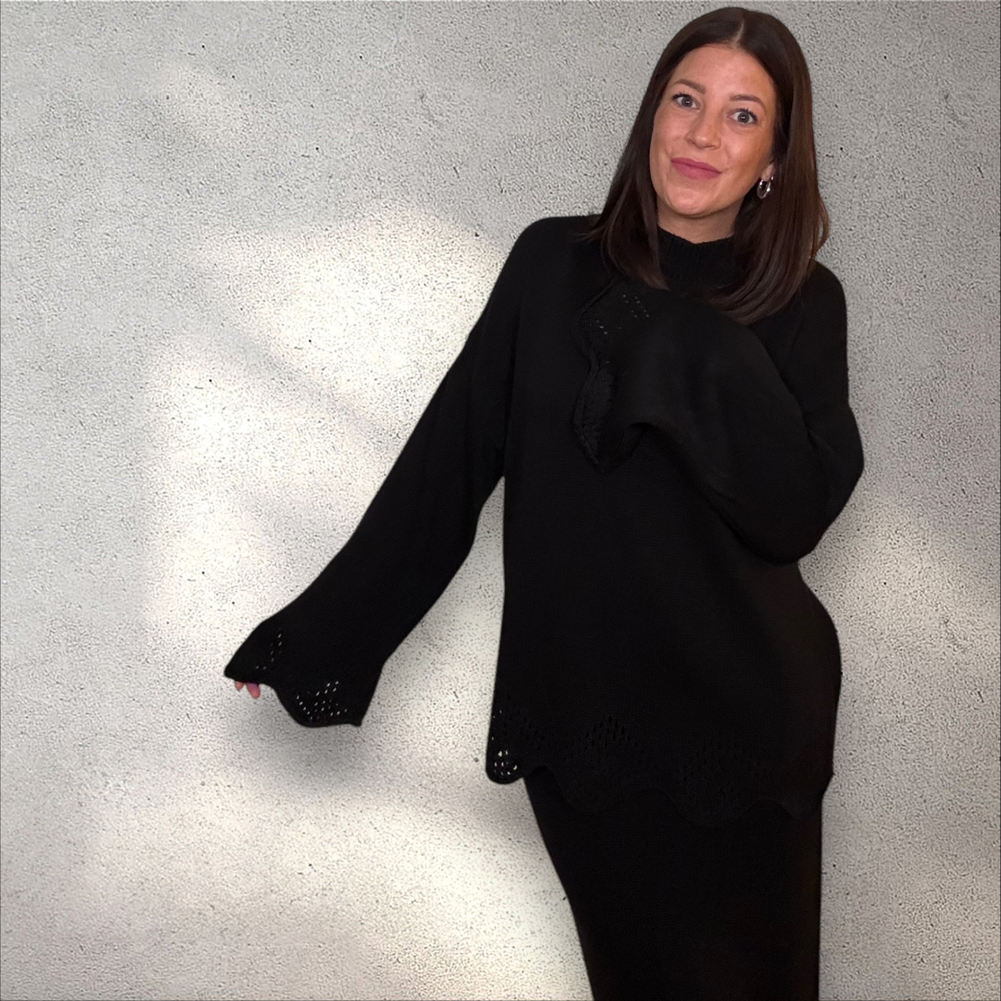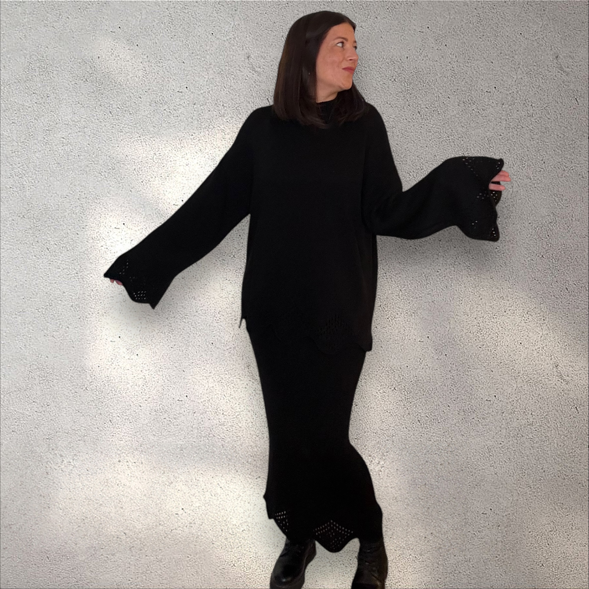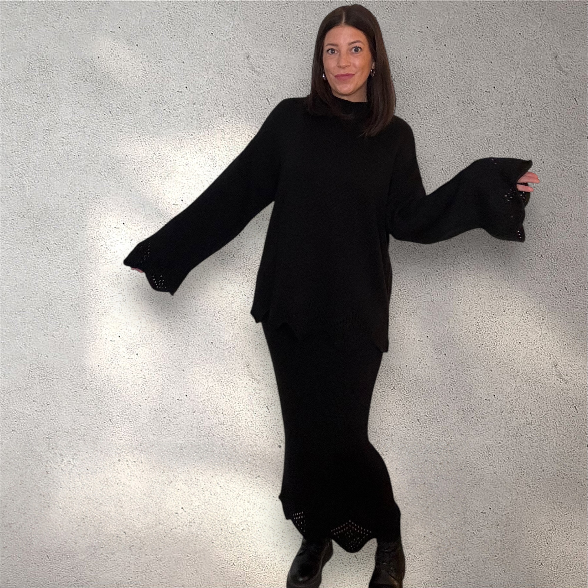 Der Strick-Zweiteiler „Welle“ begeistert durch sein harmonisches Design und seine gemütliche Passform. Der Oversize-Pullover und der figurbetonte Strickrock überzeugen durch ihren edlen Wellensaum, der dem Outfit einen verspielten und modernen Touch verleiht. Die hochwertige Strickqualität sorgt für maximalen Komfort und ein angenehmes Tragegefühl.