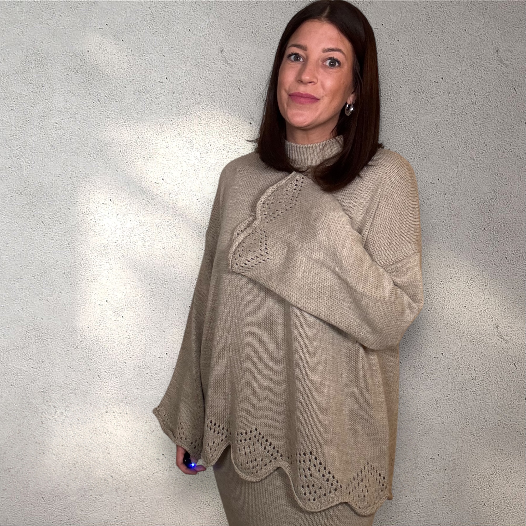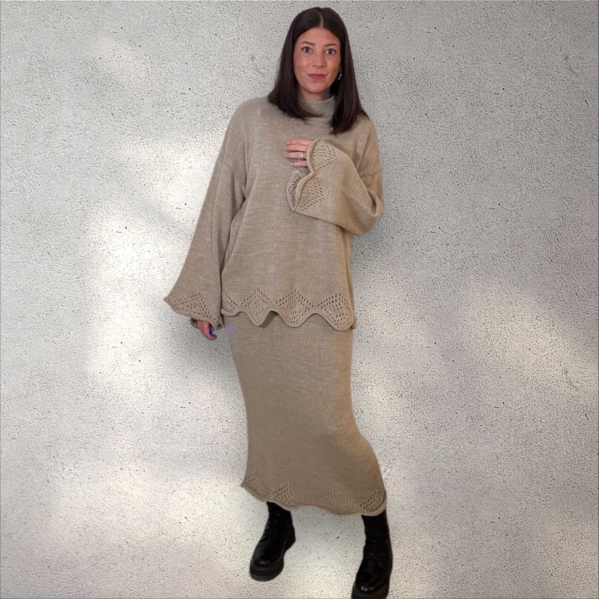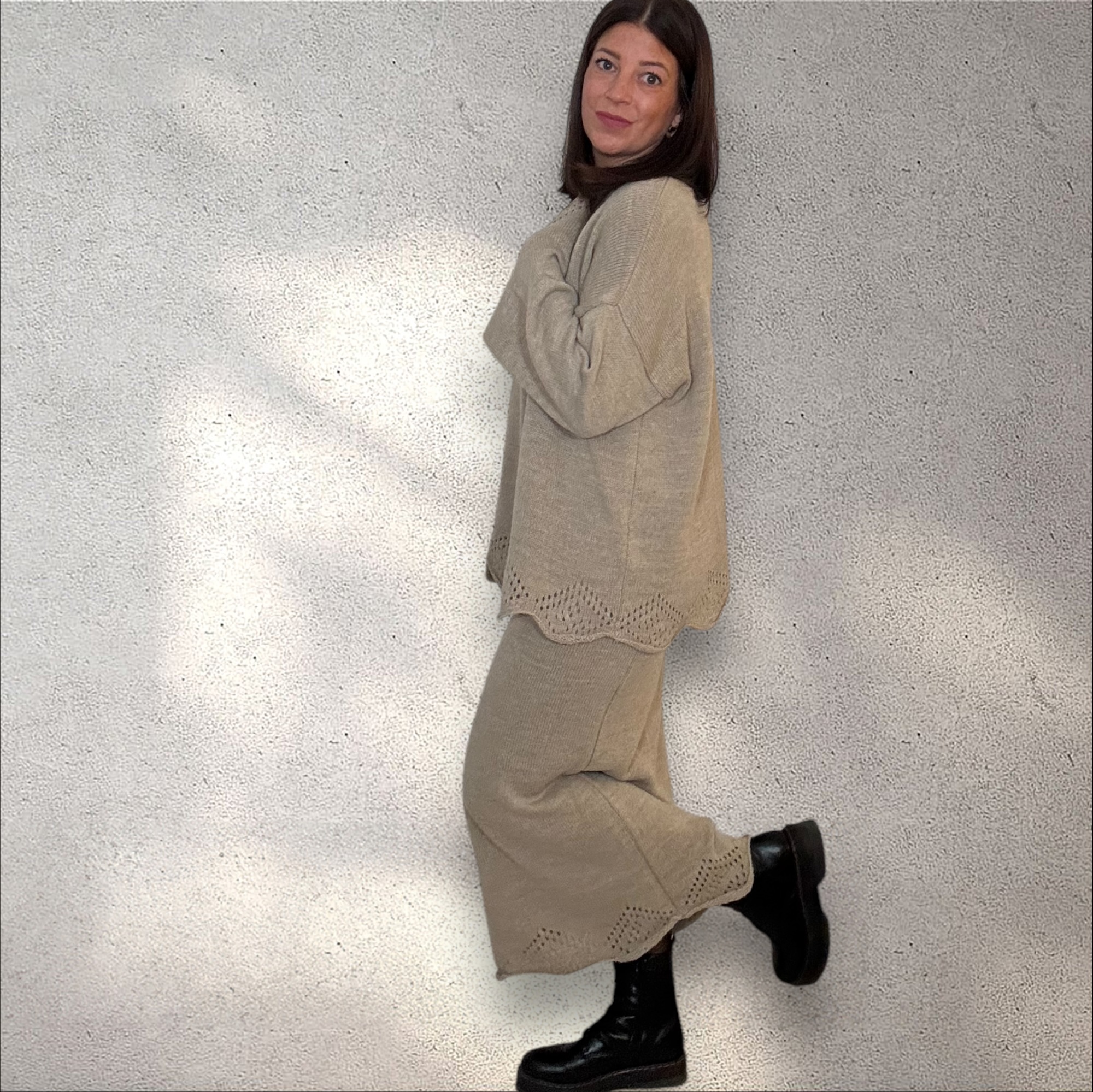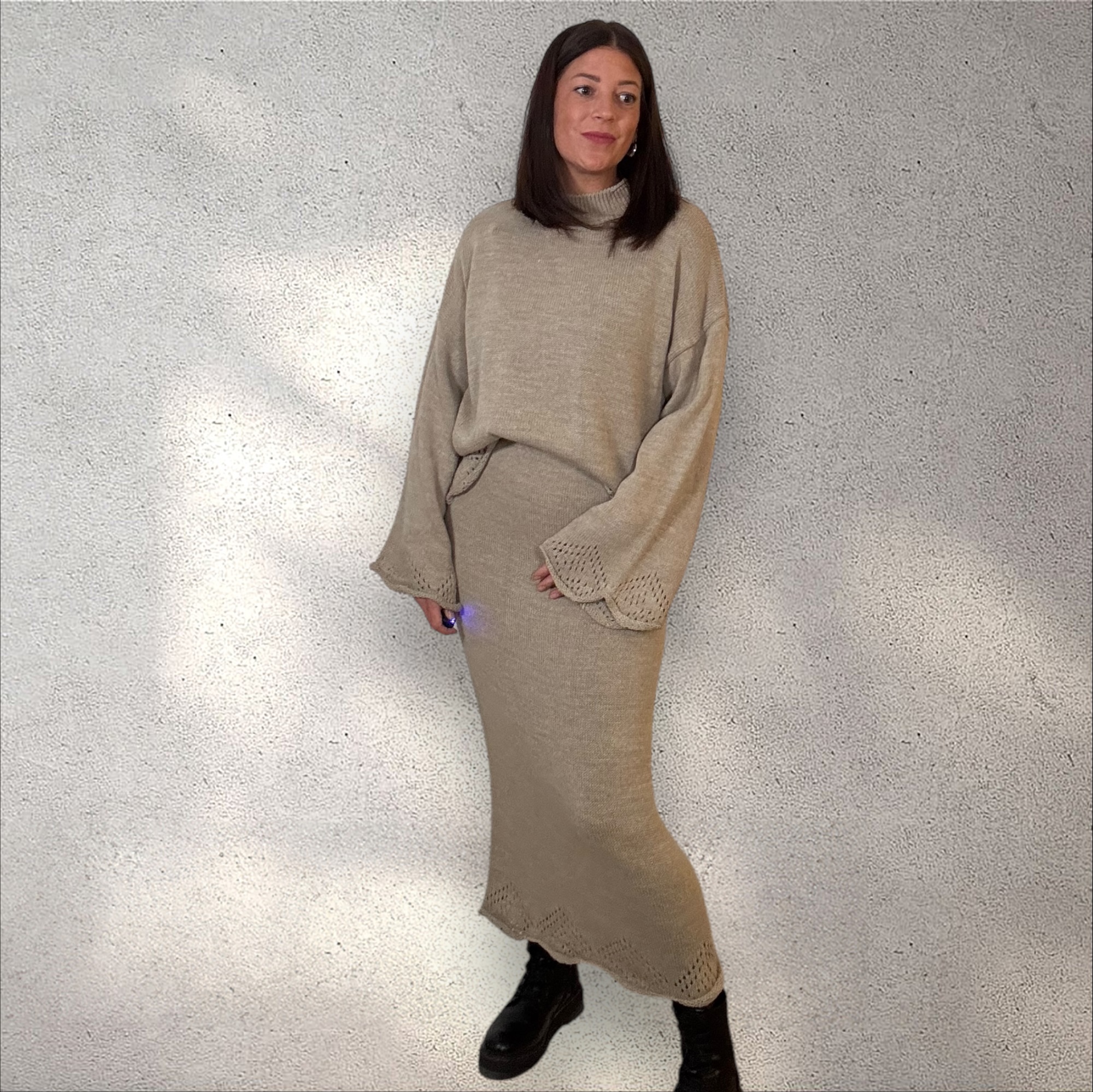 Der Strick-Zweiteiler „Welle“ begeistert durch sein harmonisches Design und seine gemütliche Passform. Der Oversize-Pullover und der figurbetonte Strickrock überzeugen durch ihren edlen Wellensaum, der dem Outfit einen verspielten und modernen Touch verleiht. Die hochwertige Strickqualität sorgt für maximalen Komfort und ein angenehmes Tragegefühl.